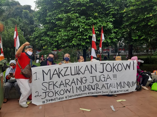 “Makzulkan Jokowi sekarang juga. Jokowi mundur atau mundurkan,” tulis banner yang penampakan di area deklarasi KAMI, Selasa (18/8/2020).