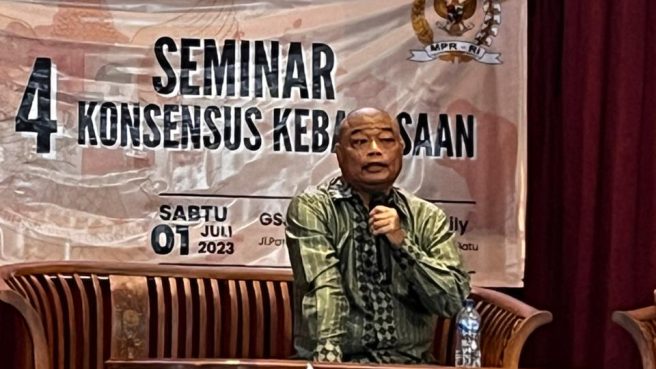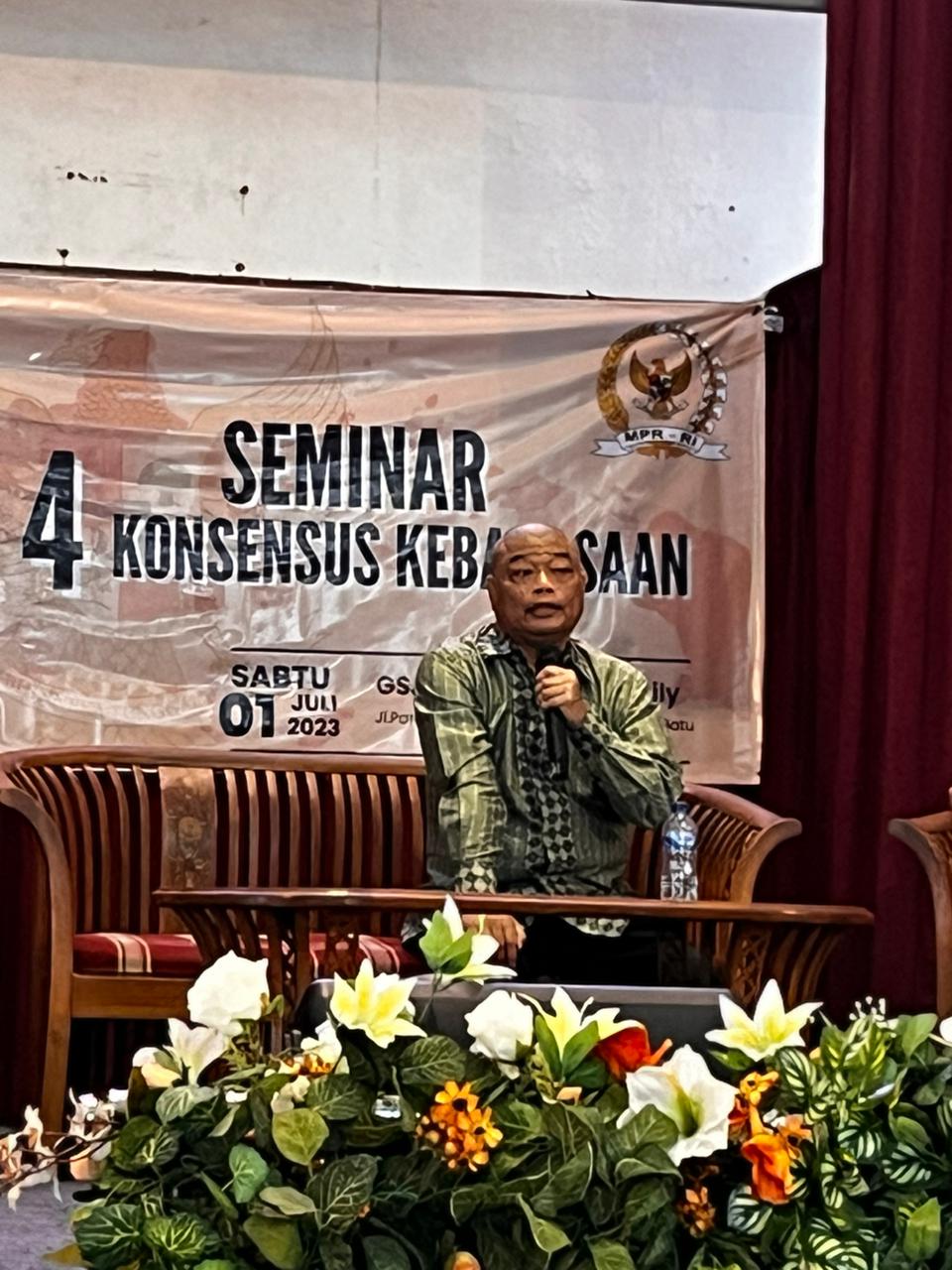 “Penting bagi kita semua menjadikan 4 Pilar Kebangsaan, yaitu Pancasila, UUD 1945, Bhinekka Tunggal Ika, dan NKRI, sebagai pedoman menghadapi pesta demokrasi ini. Kita jangan terpolarisasi. Mari jadikan bangsa Indonesia sebagai bangsa yang lebih dewasa dan betul-betul bisa mewujudkan Indonesia Emas tahun 2045,” ajaknya, seraya membuka seminar.