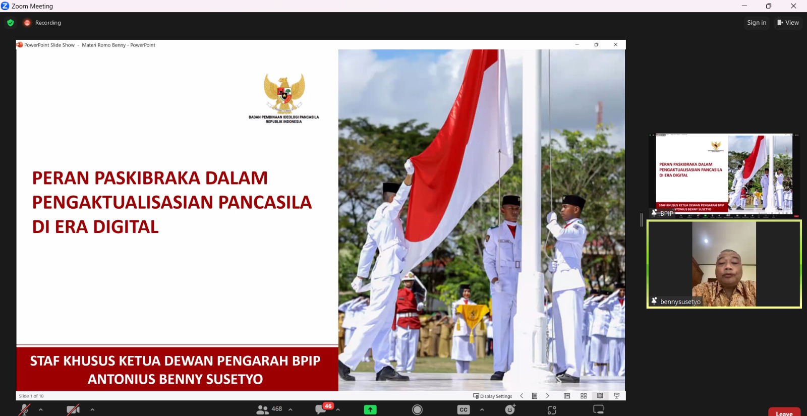 Staf Khusus Ketua Dewan Pengarah BPIP, Antonius Benny Susetyo, menyampaikan keinginannya agar generasi muda ini menjadi penyebar konten positif dan persatuan di berbagai platform sosial media, dalam acara ini, secara daring, di dalam paparannya.
