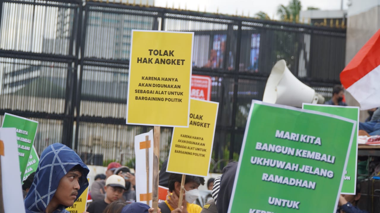 Dalam aksinya, mereka menuntut menolak wacana hak angket DPR karena hanya akan digunakan sebagai alat untuk bargaining politik.