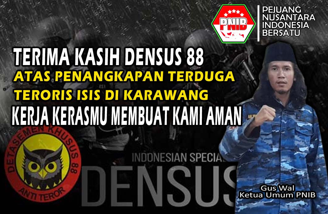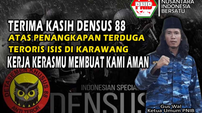 “Gerombolan eks ISIS menjadi ancaman nyata bagi kita yang harus diberantas sampai ke akar-akarnya. Mereka bisa menyamar menjadi apa saja seperti di Karawang yang berprofesi sebagai penjual bubur, tetapi di kamarnya terbukti menyimpan bahan peledak. Tidak terbayangkan jika tidak tertangkap kemudian melakukan aksi terorisme, maka aka nada korban dari kita sebagai penghuni NKRI,” ungkap Gus Wal selaku Ketua Umum PNIB kepada awak media.