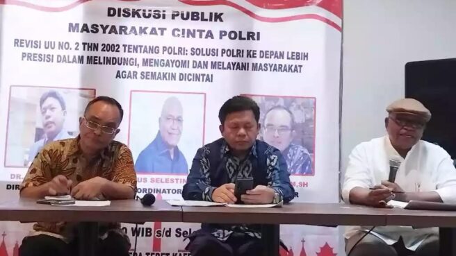 Jakarta – Revisi UU No. 2 Tahun 2002 Tentang Polri: Solusi Polri ke Depan Lebih Presisi dalam Melindungi, Mengayomi, dan Melayani Masyarakat. Hal itu merupakan salah satu poin dari Diskusi Publik yang diadakan oleh Masyarakat Cinta Polri pada hari Sabtu, 22 Juni 2024 di sebuah kafe di Tebet, Jakarta Selatan.