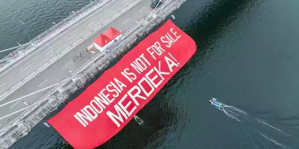 Jakarta – Penggiat Lingkungan hidup Greenpeace membentangkan spanduk besar bertuliskan “Indonesia is Not For Sale” di Jembatan Pulau Galang, Penajam Paser Utara, Provinsi Kalimantan Timur pada Hari Kemerdekaan RI ke 79 Tahun , Sabtu 17 Agustus 2024.