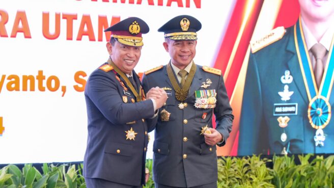 Jakarta – Kapolri Jenderal Listyo Sigit Prabowo menyematkan tanda kehormatan Bintang Bhayangkara Utama (BBU) kepada Panglima TNI Jenderal Agus Subiyanto di Gedung Rupattama Mabes Polri, Jakarta Selatan, Jumat (4/10/2024).