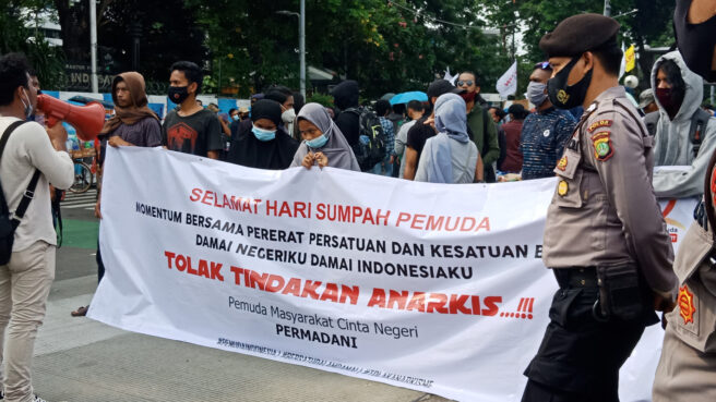 Menurut Koordinator aksi Miftahudin, momen hari Sumpah Pemuda yang ke-94 tahun 2024 pihaknya menghimbau kepada para pendemo saat menyampaikan aspirasinya mentaati hukum dan peraturan perundang-undangan yang berlaku.