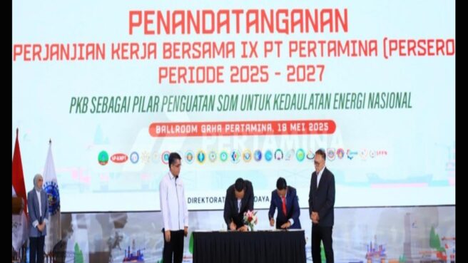 JAKARTA — PT Pertamina (Persero) bersama Federasi Serikat Pekerja Pertamina Bersatu (FSPPB) secara resmi menandatangani Perjanjian Kerja Bersama (PKB) ke-IX untuk periode 2025–2027. Penandatanganan berlangsung di Ballroom Grha Pertamina, Jakarta, dan disaksikan langsung oleh Menteri Ketenagakerjaan Republik Indonesia, Yassierli.