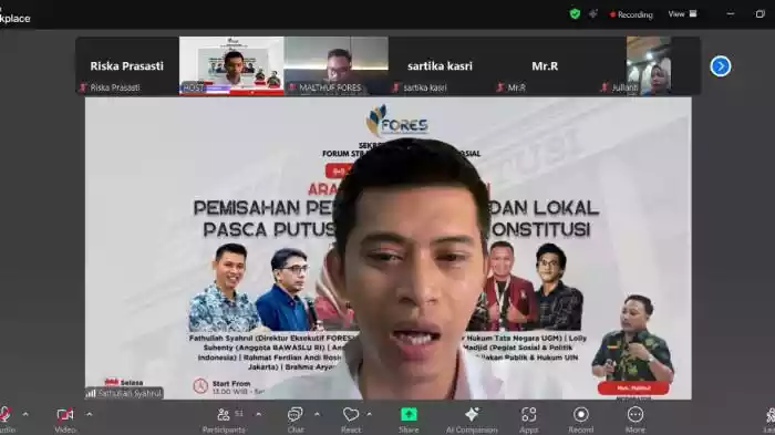 Jakarta – Forum Strategis Pembangunan Sosial (FORES) webinar nasional bertajuk “Arah Baru Demokrasi: Pemisahan Pemilu Nasional dan Lokal Pasca Putusan Mahkamah Konstitusi”, Selasa (29/7/2025).