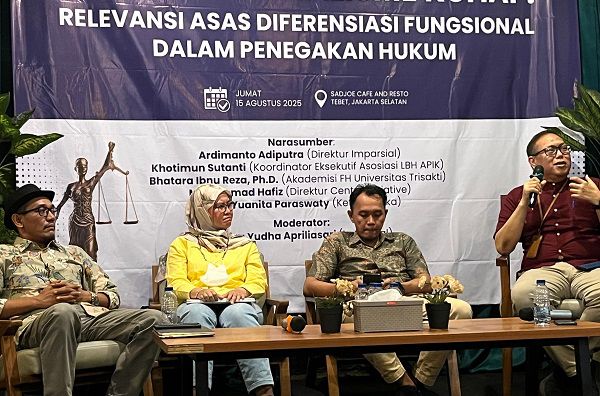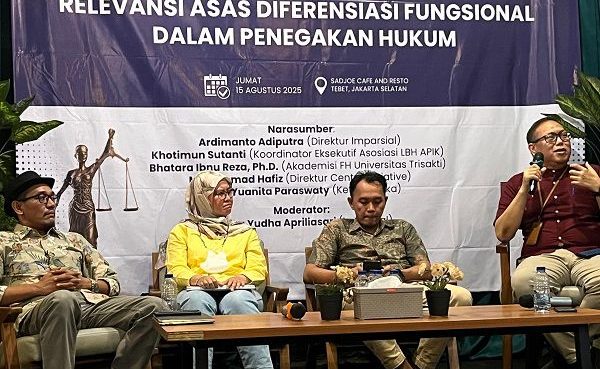 Jakarta – Revisi Kitab Undang-Undang Hukum Acara Pidana (KUHAP) yang saat ini tengah dibahas menuai sorotan tajam dari berbagai kalangan. Dalam diskusi publik bertajuk “Konstitusionalisme KUHAP: Relevansi Asas Diferensiasi Fungsional dalam Penegakan Hukum” yang digelar di Sadjoe Cafe and Resto, Tebet, Jumat (15/8), para pembicara menilai bahwa arah revisi KUHAP berpotensi melemahkan prinsip-prinsip demokrasi dan perlindungan hak asasi manusia (HAM).