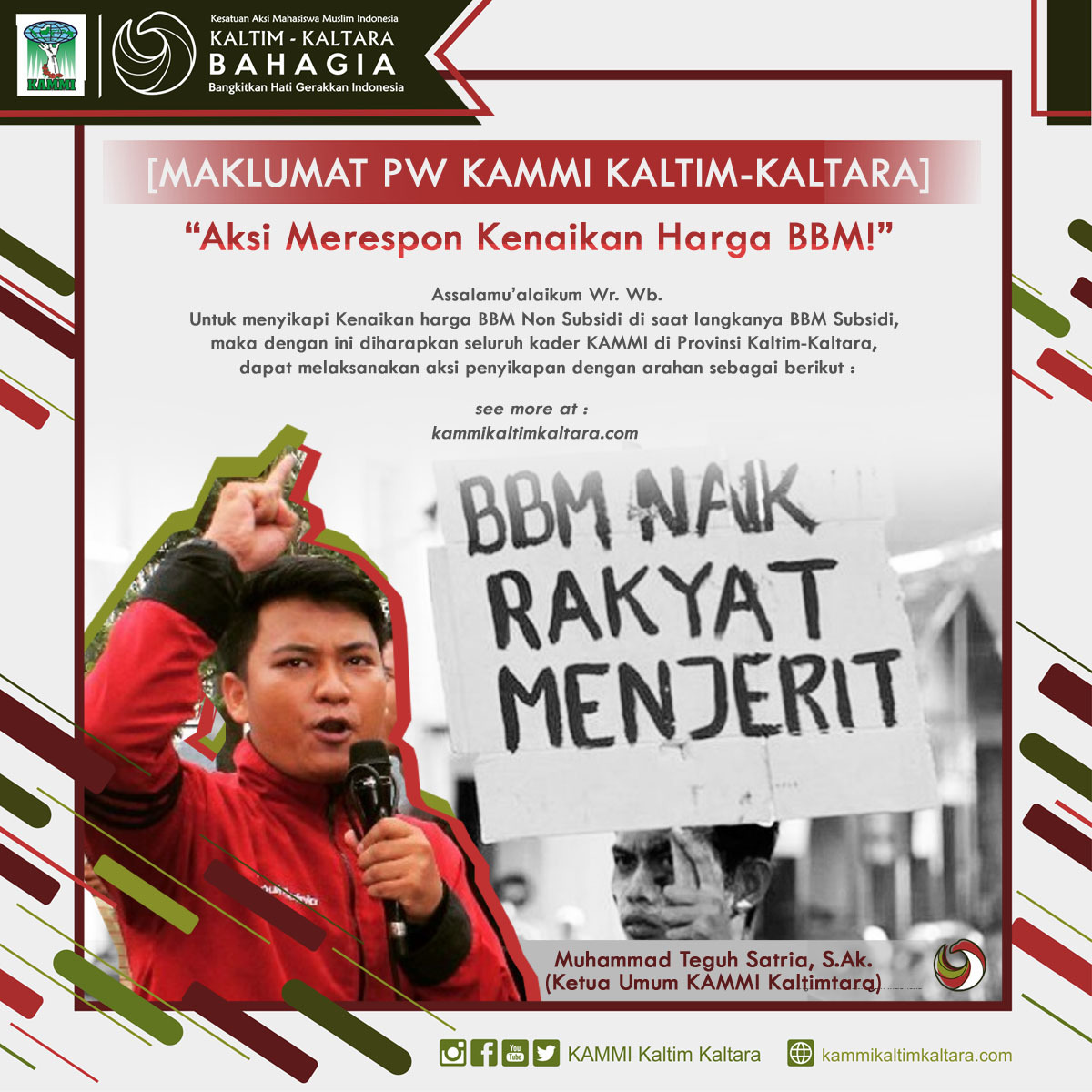 “Kami menuntut pemerintah untuk menjamin ketersediaan BBM dan tabung gas LPG 3 kg bersubsidi di seluruh Indonesia dan memastikan penyalurannya tepat sasaran melalui regulasi yang berkeadilan,” tegas Ketum PW KAMMI Kaltimtara Muhammad Teguh Satria dalam pesan rilisnya hari ini.
